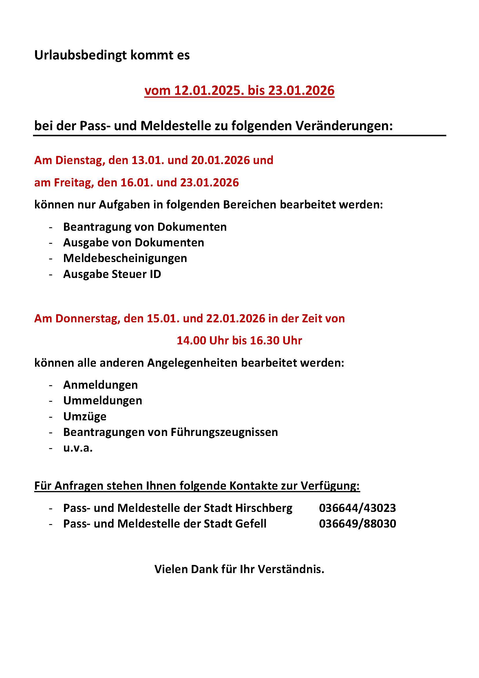 Veränderte Öffnungszeiten der Pass- und Meldestelle